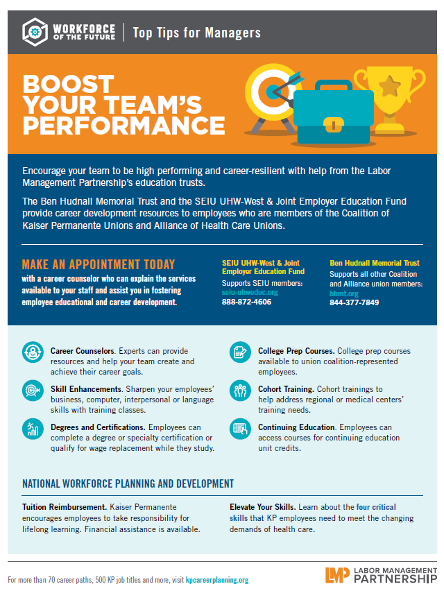 TOOLS Boost Your Team's Performance Share Instagram Email Format:PDFSize:8.5" x 11"Intended audience:Frontline managersBest used:Use this guide to understand the services available to your staff and foster employee educational and career development.Related tools: Prepare Today for the Jobs of the Future Workforce of the Future Conversation Toolkit Workforce of the Future Facilitator's Guide Manager’s Guide to Workforce Development Advance Your KP Career Download PDF 20 people found this helpful. Was it helpful to you? YesNo