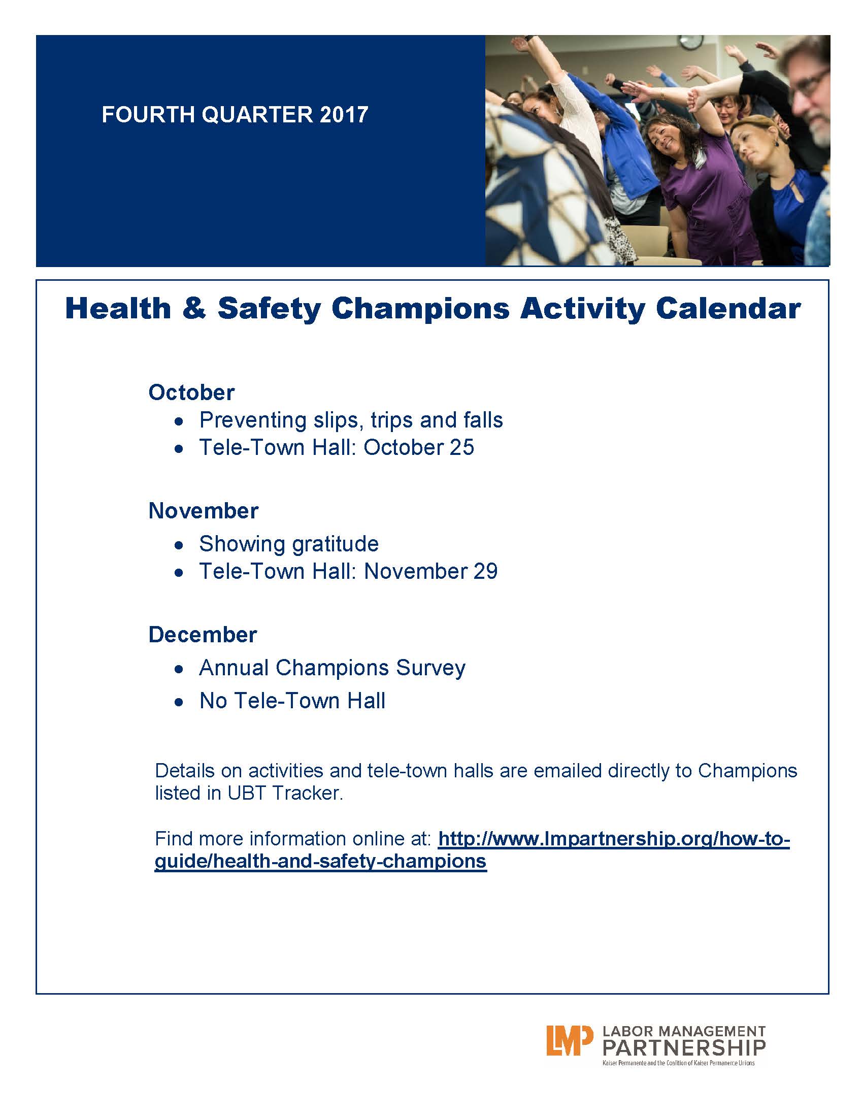 Champions can use this flier to plan health and safety activities with their teams during the third quarter of 2017.
