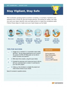 TOOLS Health and Safety Champions — August 2020 Focus Share Instagram Email Format:PDFSize:One page, 8.5" x 11"Intended audience:UBT health and safety championsBest used:Round for safety to identify and minimize the risks associated with the spread of COVID-19. Related tools: Health and Safety Champions — June 2020 Focus Health and Safety Champions — July 2020 Focus Health and Safety Champions — September 2020 Focus Health and Safety Champions — October 2020 Focus Health and Safety Champions — November 2020 Focus Download PDF 28 people found this helpful. Was it helpful to you? YesNo