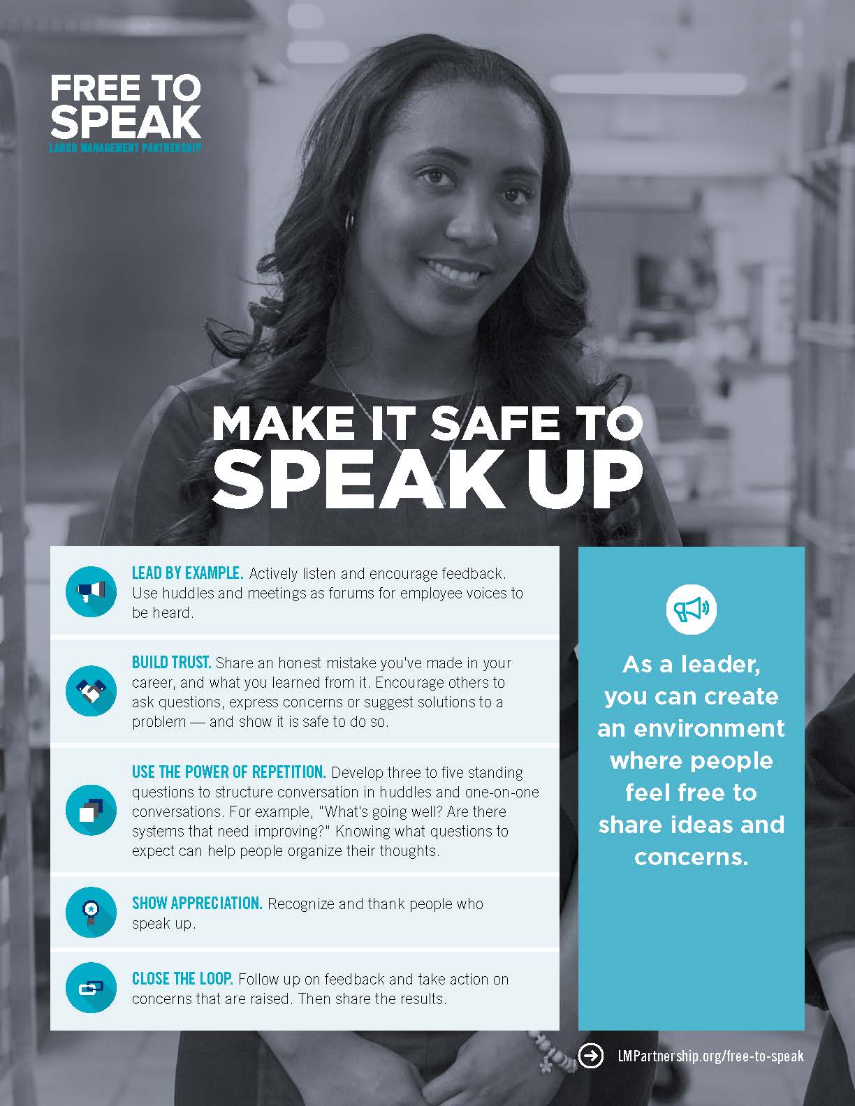 Five tips to help frontline managers create an environment where workers feel safe sharing ideas and concerns. Post in your work space and share with other managers.