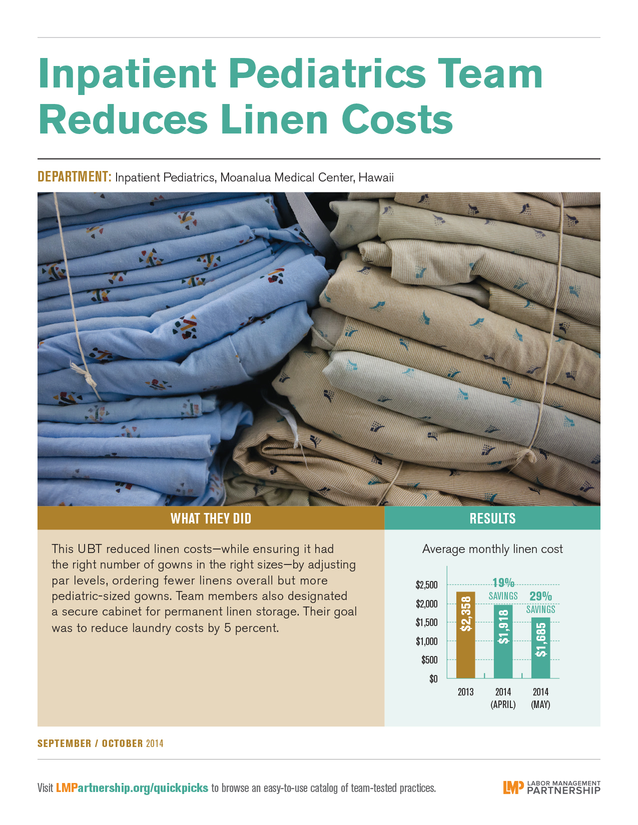 Hang this poster highlighting a UBT that reduced linen costs while maintaining a proper supply on bulletin boards, in break rooms and other staff areas. Share with teams to spark ideas about how they can save.
