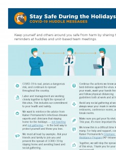 TOOLS Stay Safe for the Holidays: COVID-19 Huddle Messages Share Instagram Email Format:PDFSize:8.5" x 11" Intended audience:Frontline workers and managers Best used:Share these reminders at huddles and unit-based team meetings. Related tools: Safe and Effective Vaccines: COVID-19 Huddle Messages Make the Workplace Safer: COVID-19 Huddle Messages Health and Safety Champions—July 2018 Focus Health and Safety Champions — February 2021 Focus Health and Safety Champions — February 2020 Focus Download PDF 15 people found this helpful. Was it helpful to you? YesNo
